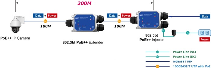 - Doubles the maximum connection distance between PoE source and device from 100 m (328 ft.) to 200m (656 ft.)